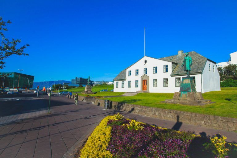 Street scene street in downtown Reykjavik, Iceland, leading to the Hallgrimskirkja Church, one of the landmarks of the city